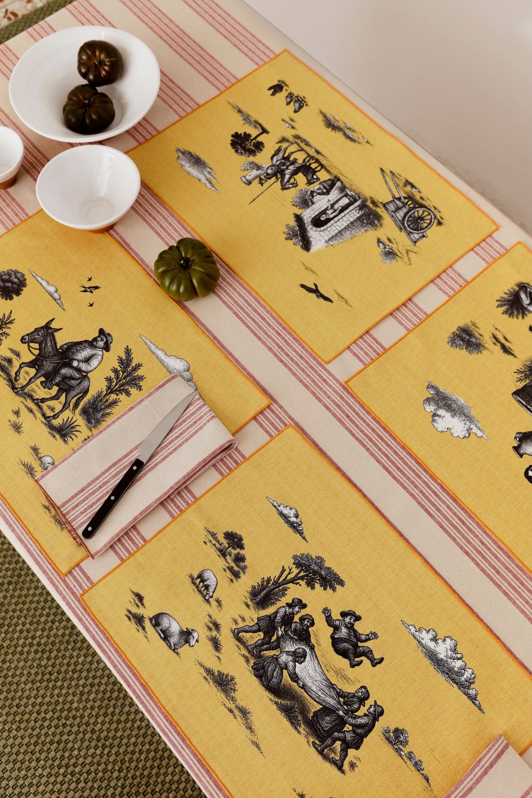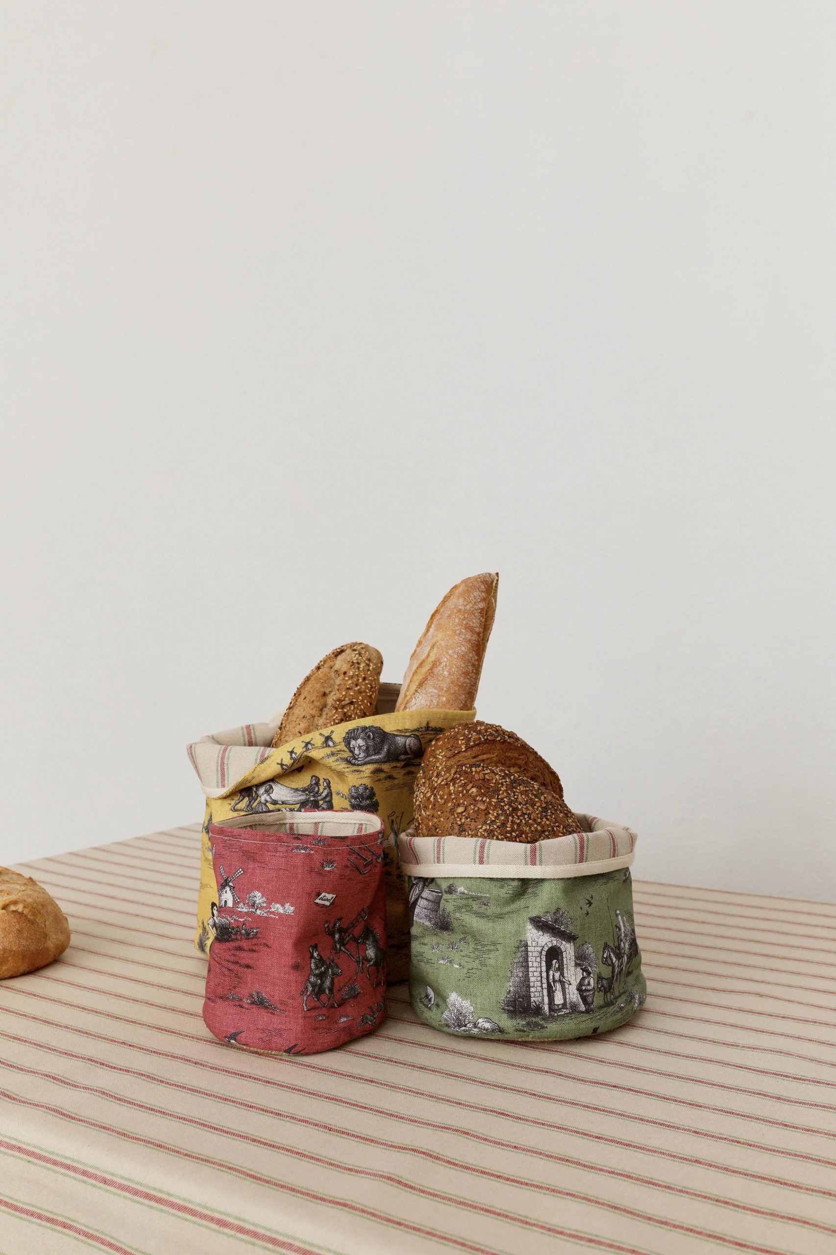La tela ya se ha producido para la nueva colección de primavera y se ha aplicado a distintos formatos que conviven en el catálogo: manteles, salvamanteles, paneras y tote bags. El diseño funciona y mantiene su legibilidad tanto en piezas de gran formato como en objetos más pequeños.