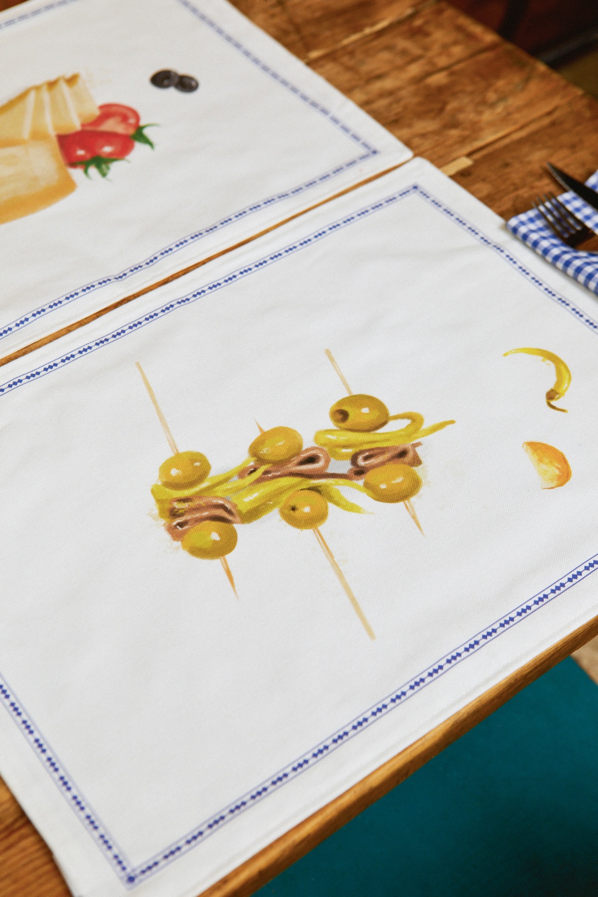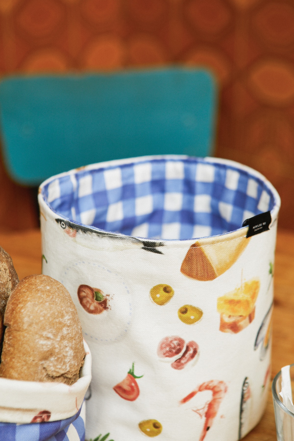 Detalle del tejido de la colección Tapas de Eturel, con motivos gastronómicos españoles integrados en un patrón continuo sin cortes visibles.